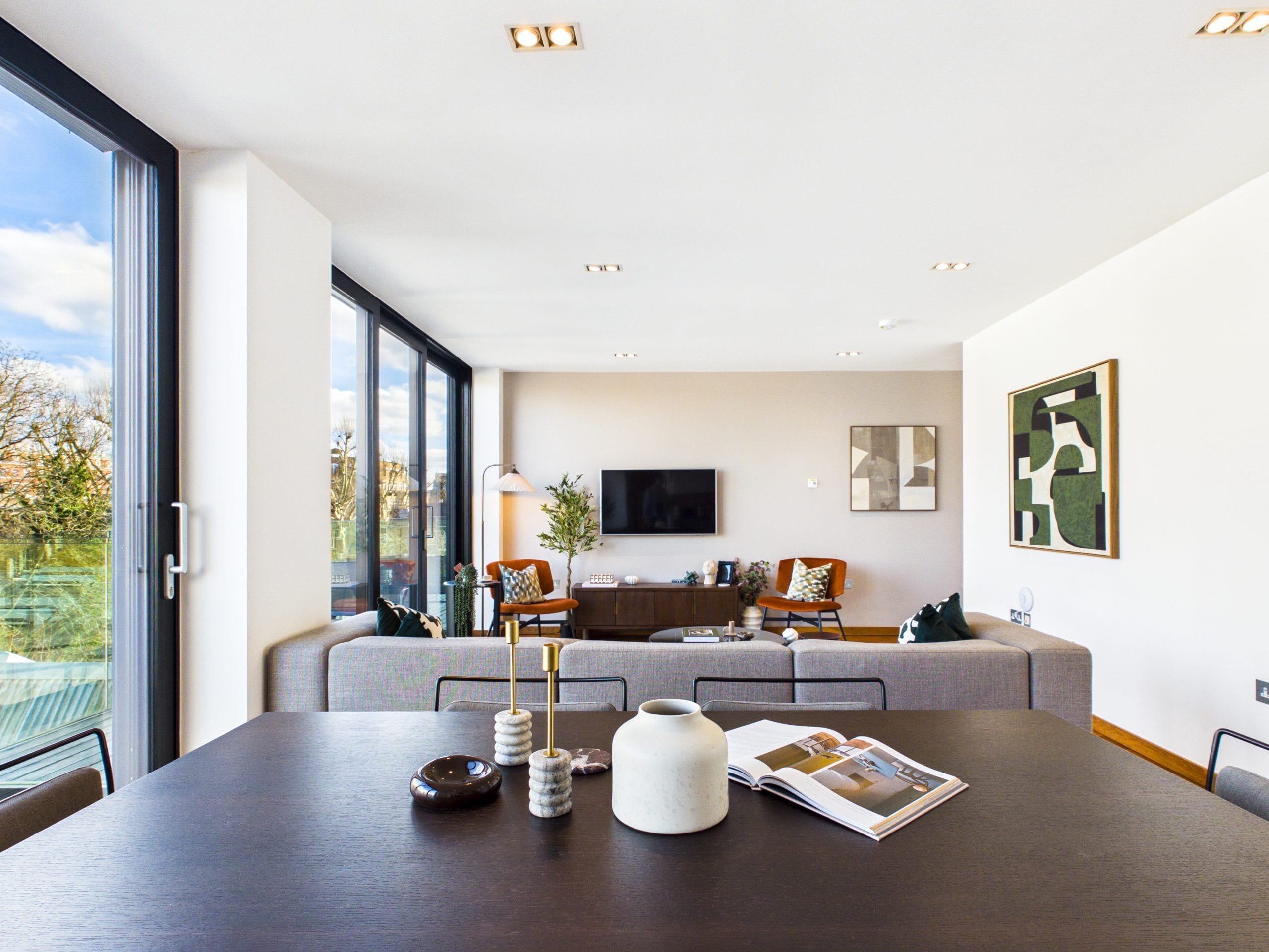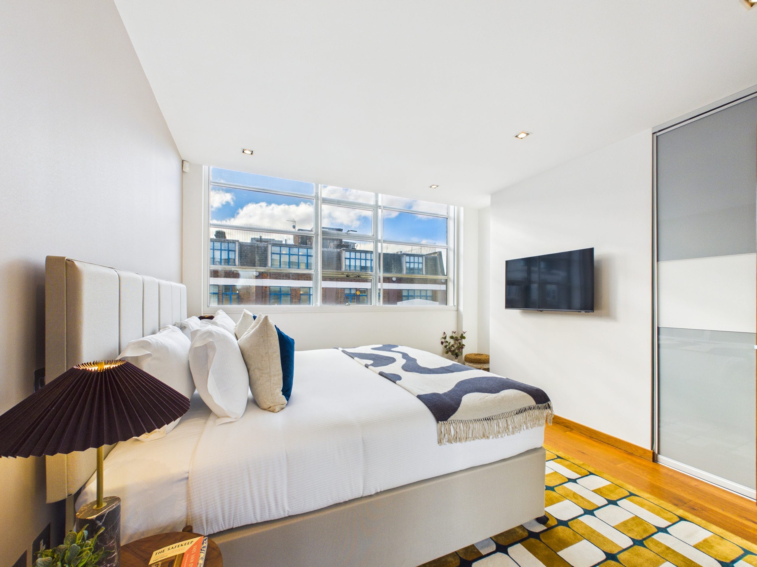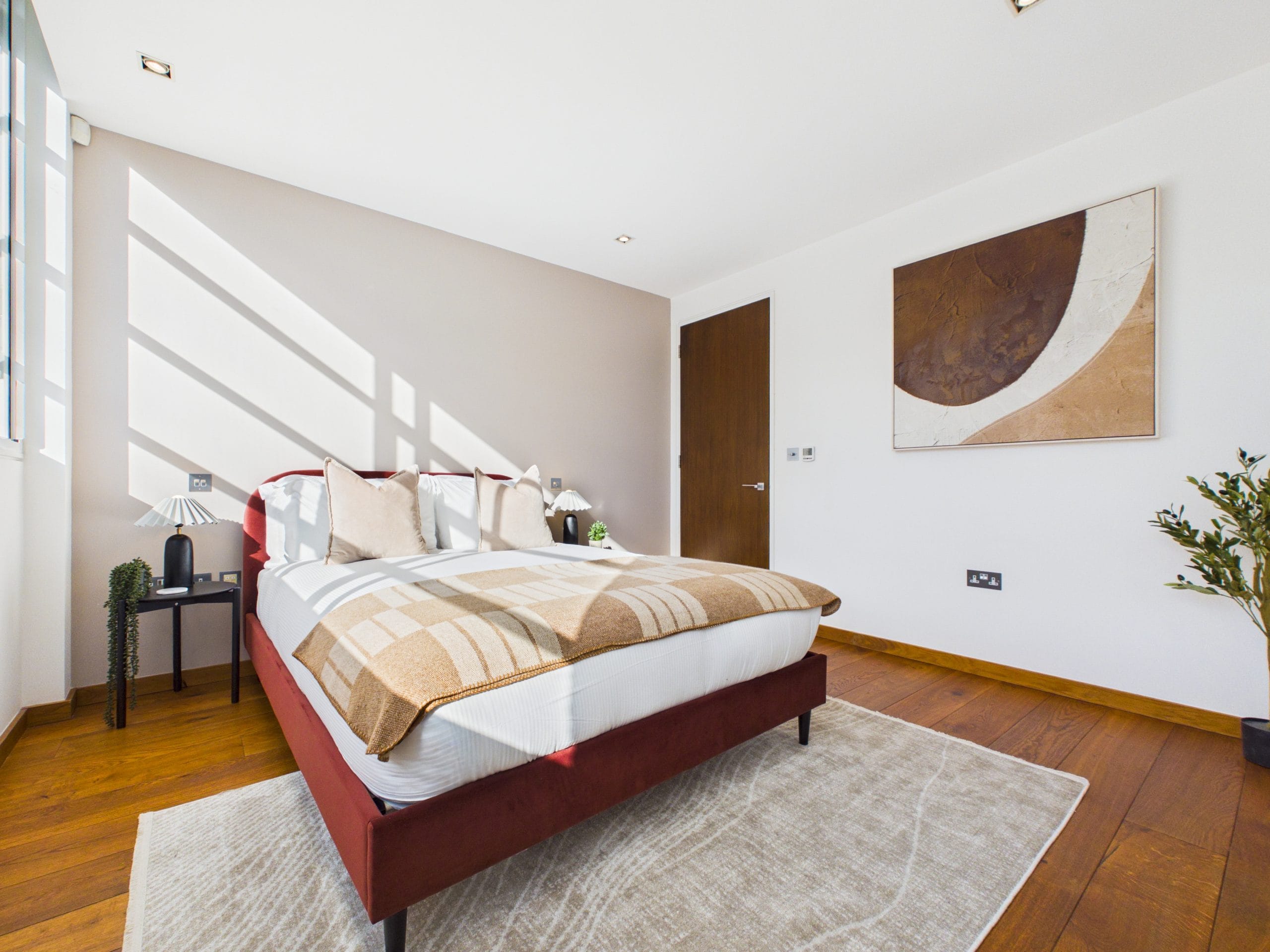 This modern yet edgy two bedroom, two bathroom apartment is the perfect space for those with a creative flair. Set within the upper floor of a modern warehouse conversion, the living and dining area stars a comfy sofa, Smart TV, dining table and a fully-fitted kitchen with high spec appliances.