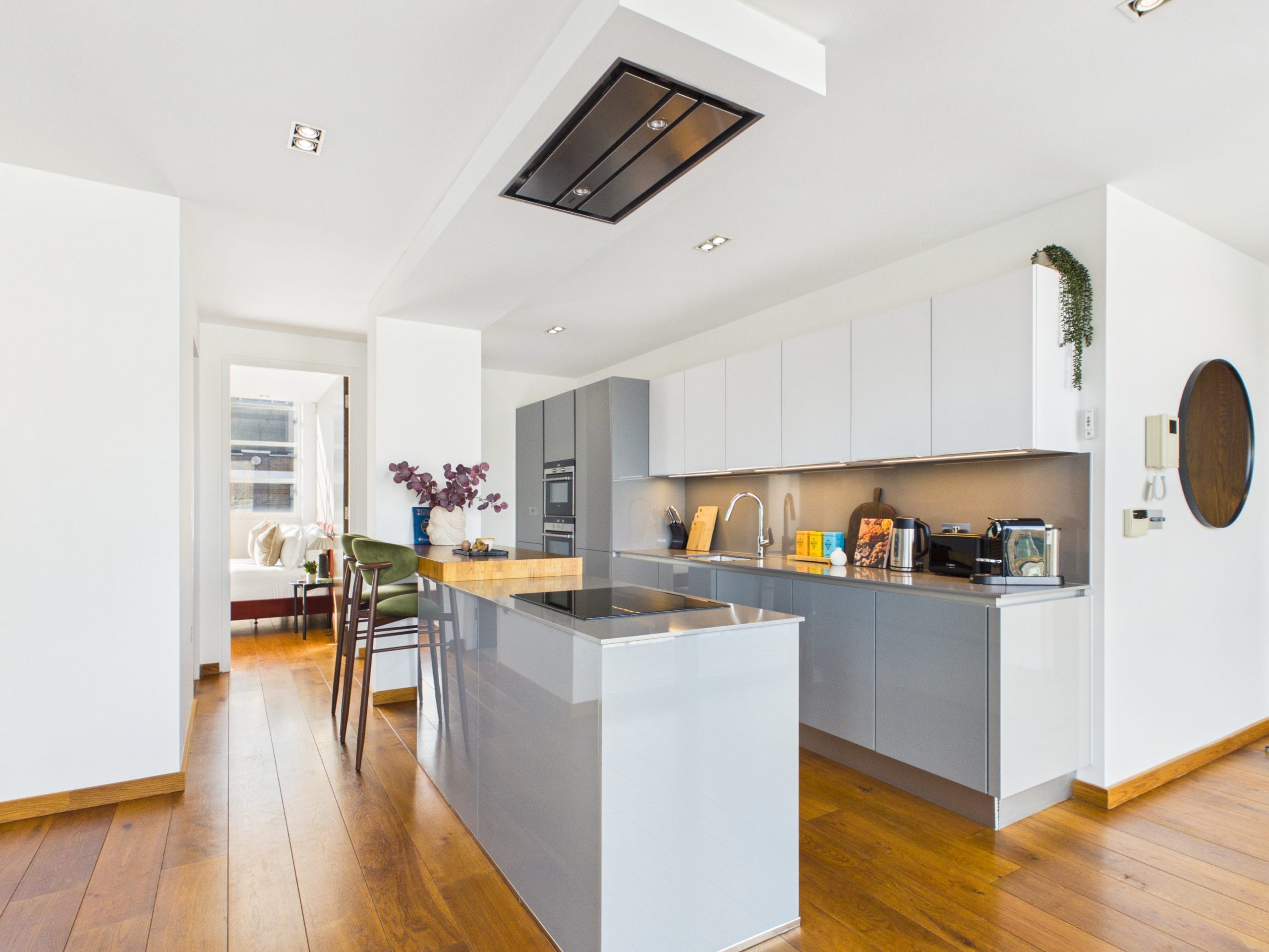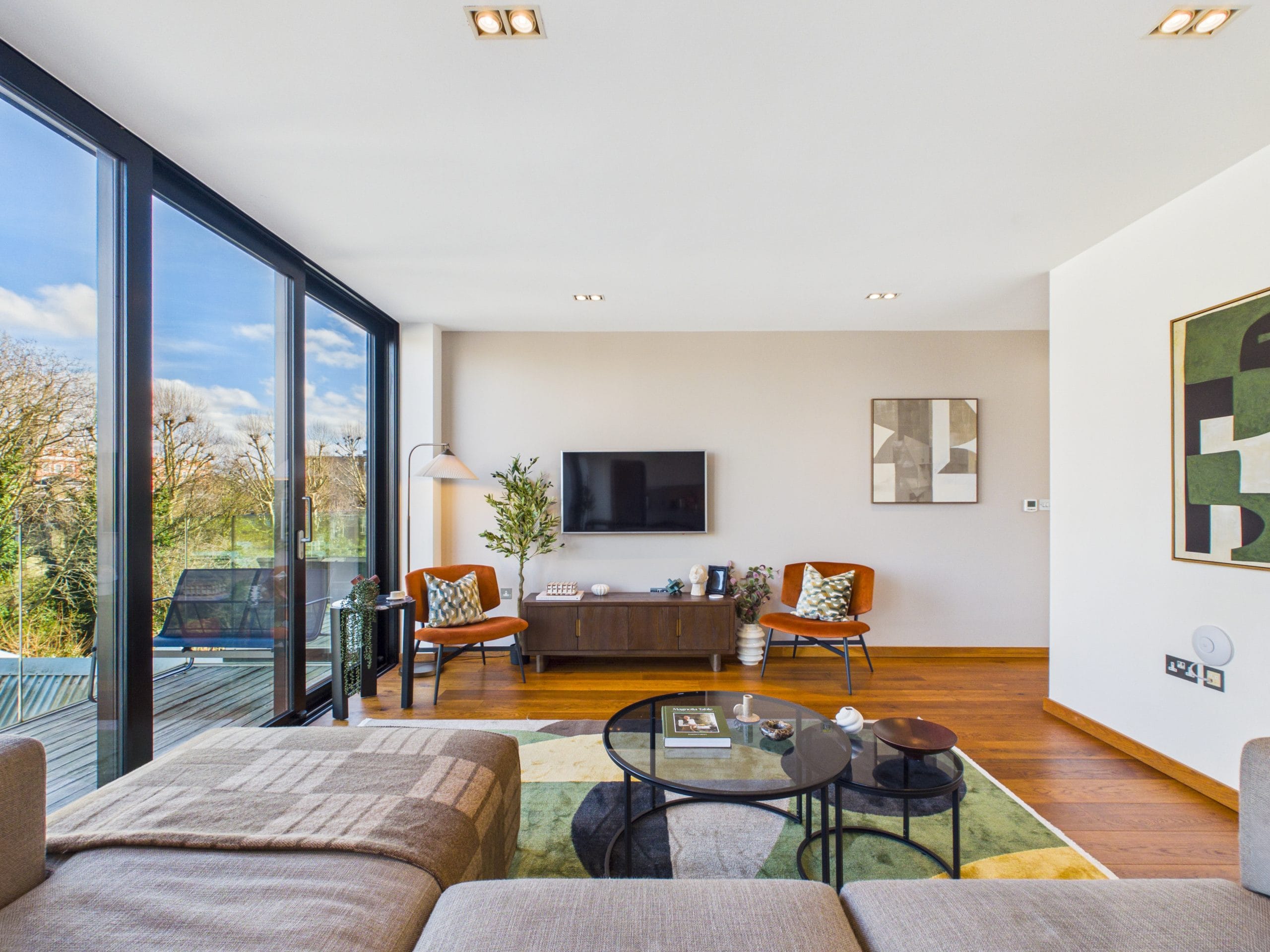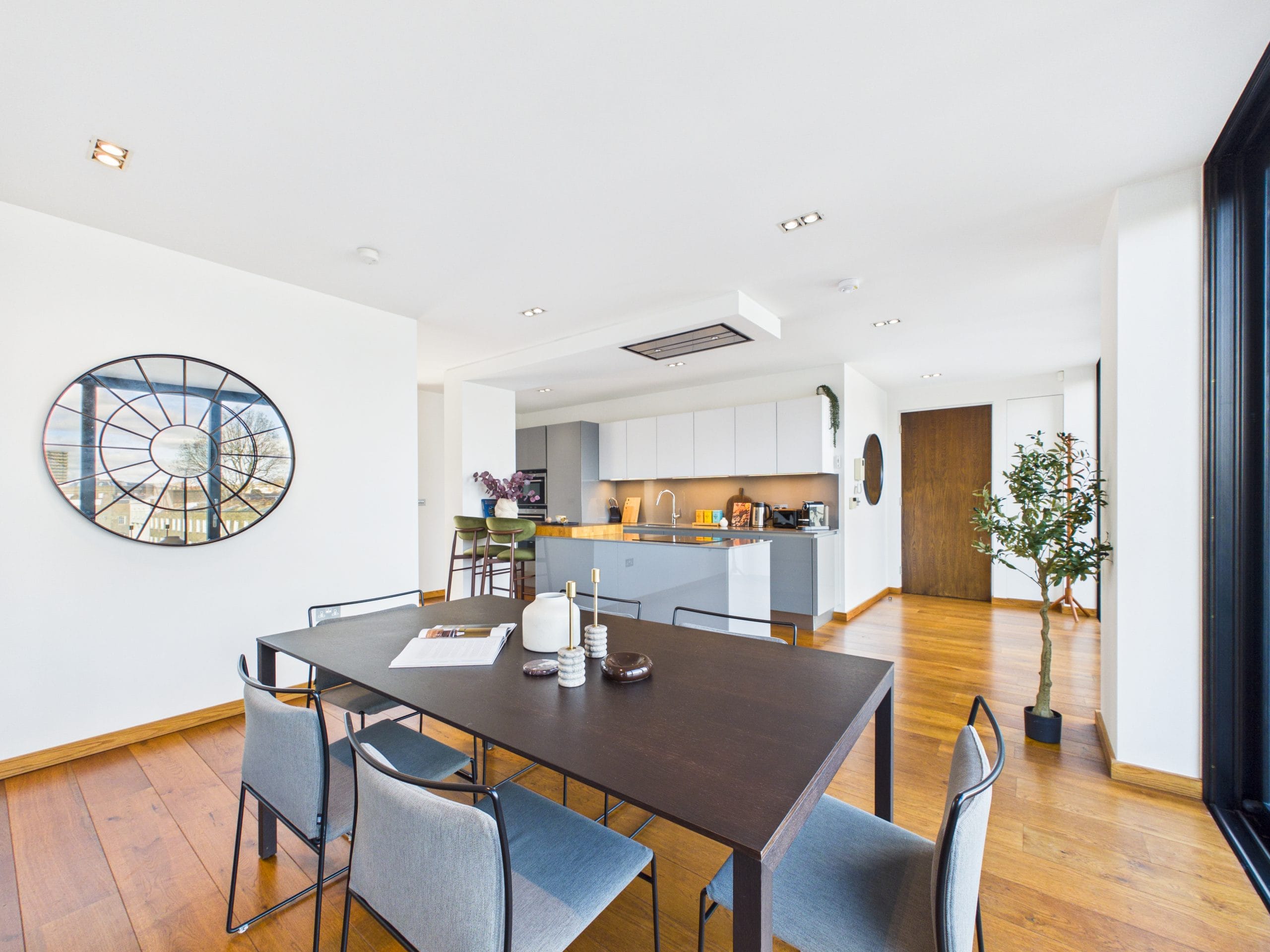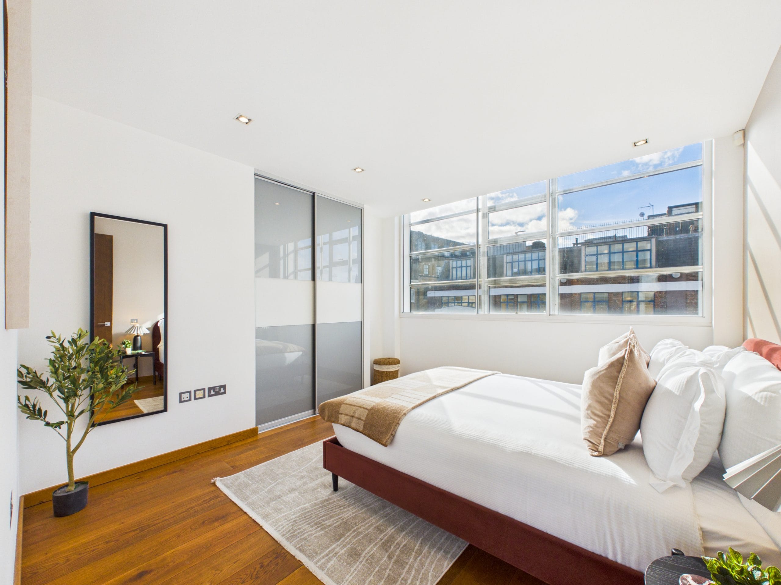 This modern yet edgy two bedroom, two bathroom apartment is the perfect space for those with a creative flair. Set within the upper floor of a modern warehouse conversion, the living and dining area stars a comfy sofa, Smart TV, dining table and a fully-fitted kitchen with high spec appliances.