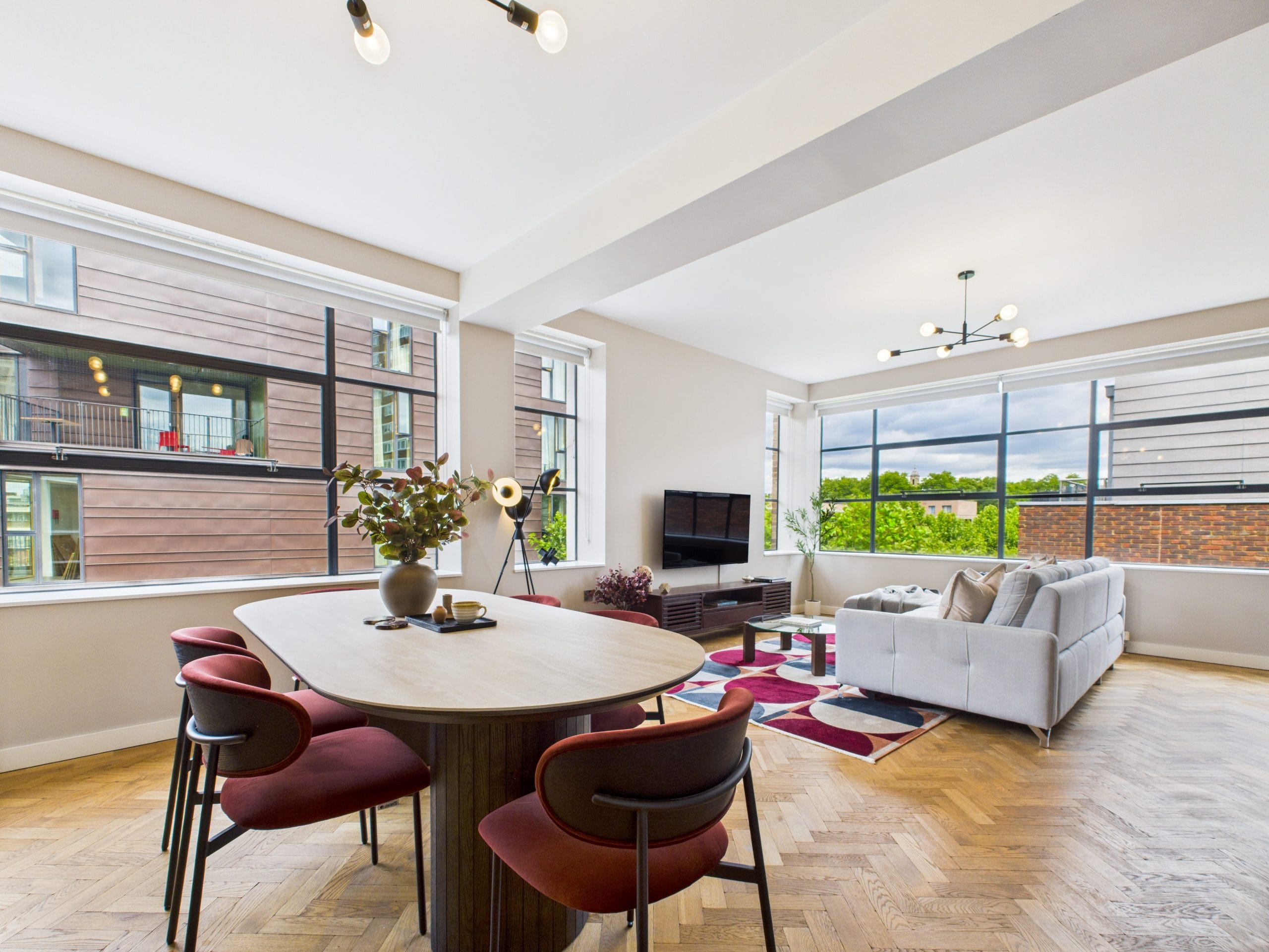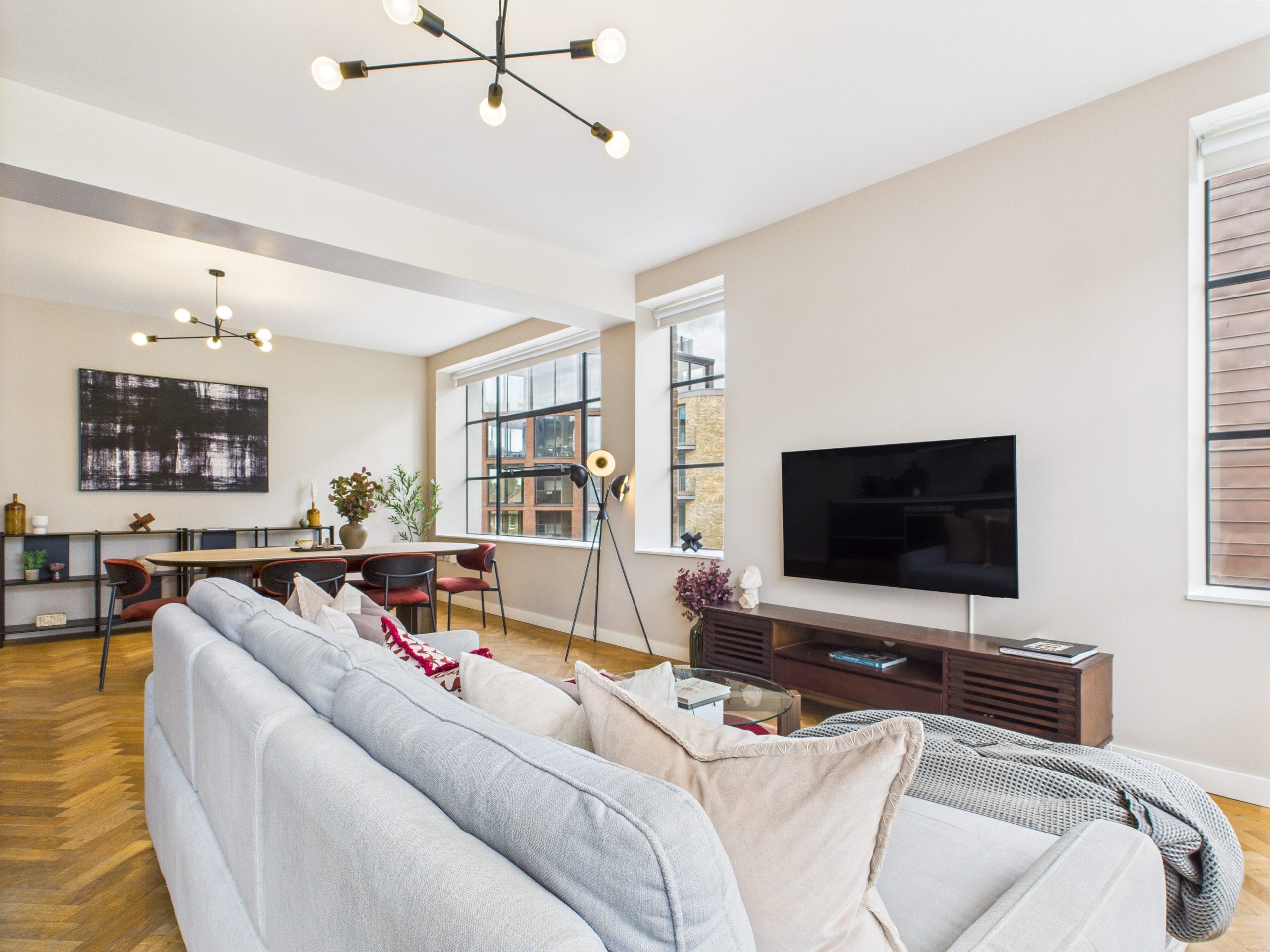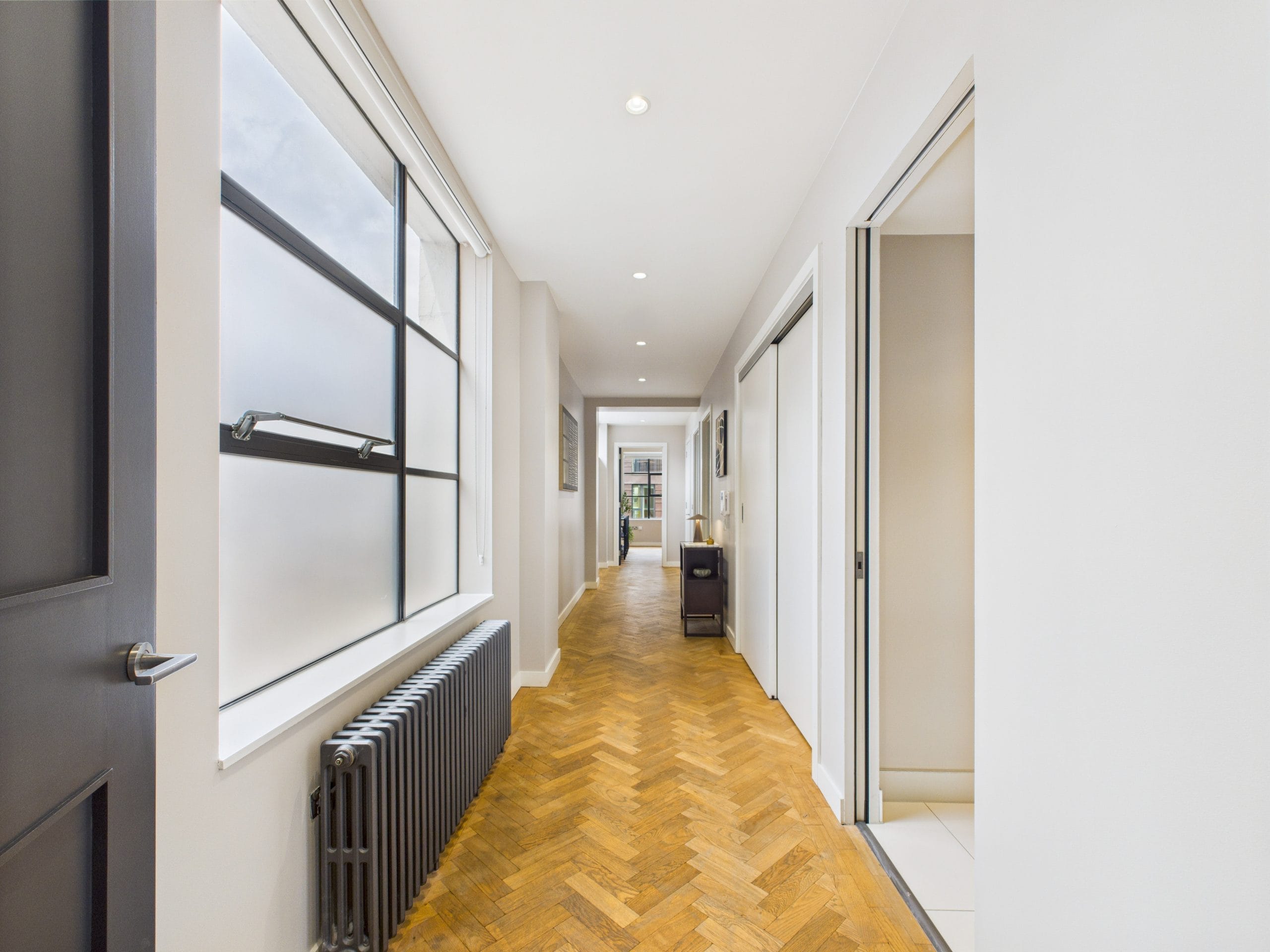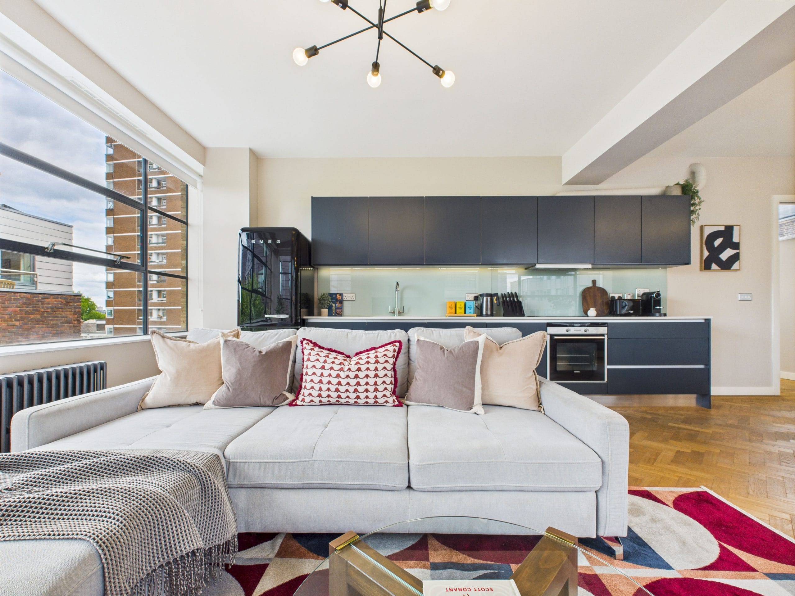 This apartment is based on the 4th floor of a residential/office building near Old Street, a prime London location. Occupying the corner of the building and covered in large windows on the exterior walls fills the space with natural light and offers views across to the City.